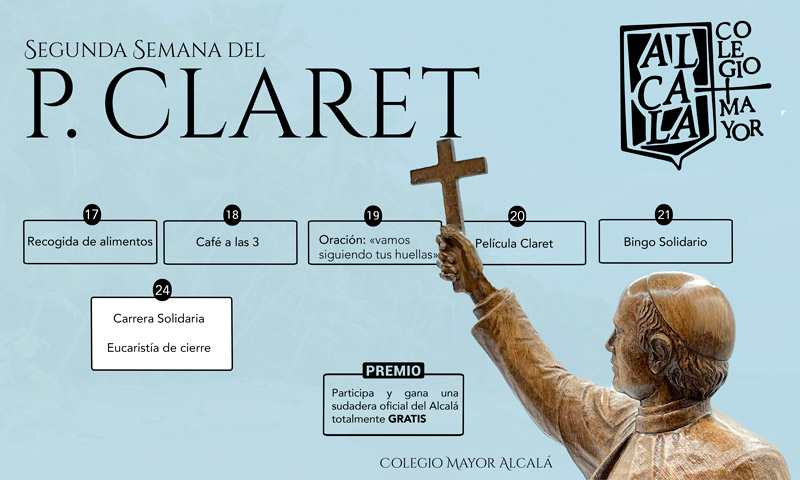 El 24 de octubre es el día en el que recordamos al Padre Claret, fundador de la Congregación de los Misioneros Claretianos, a la que pertenece el Colegio Mayor. El Padre Claret fue un hombre de fe, promotor de la cultura pero, sobre todo, fue un hombre que emanaba caridad, y que dedicó su vida a la evangelización y al servicio de los más necesitados. En este día, celebramos una eucaristía en su memoria, y durante toda una semana realizamos diversas actividades culturales y religiosas que nos acercan a su figura y a su mensaje.