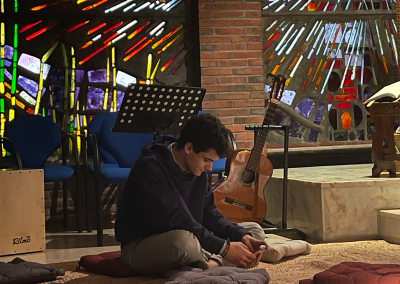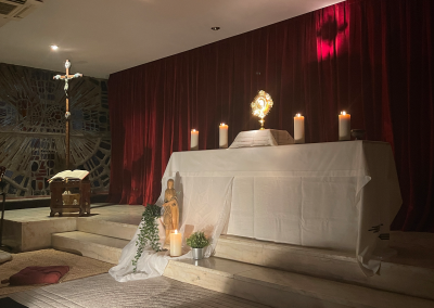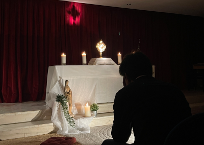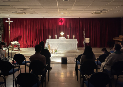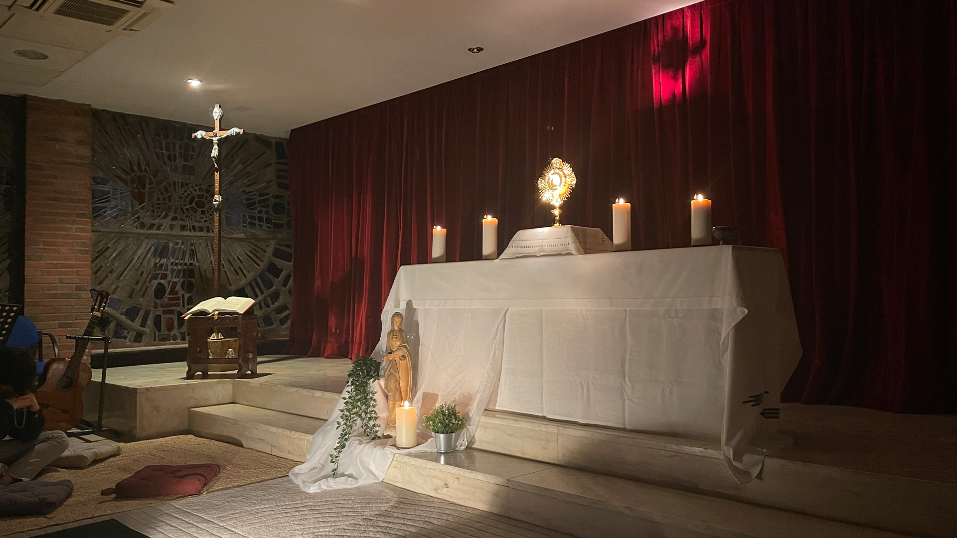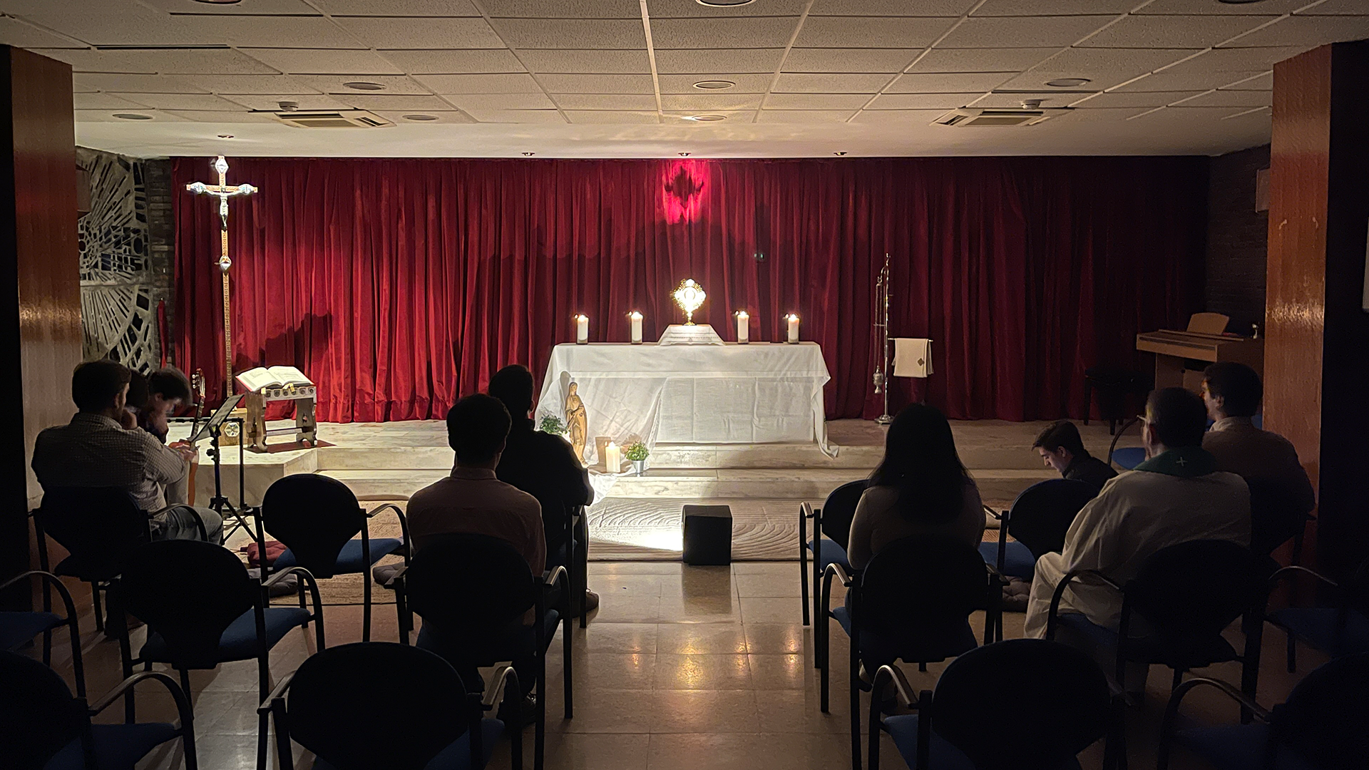 El evento comenzó con la exposición del Santísimo, dirigida por el P. Luis Arribas, miembro de la comunidad claretiana, quien a las 20:00 abrió este espacio de oración y reflexión. Desde ese momento, los colegiales fueron llegando de manera libre y espontánea para dedicar un rato a estar frente a Él, en un ambiente de silencio y tranquilidad.