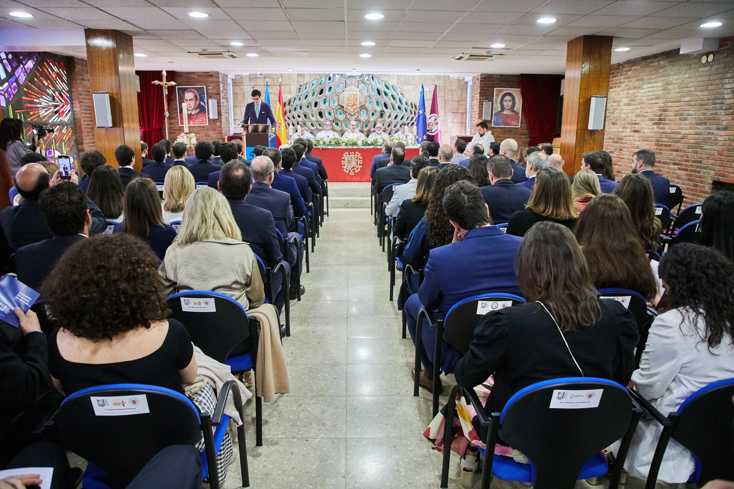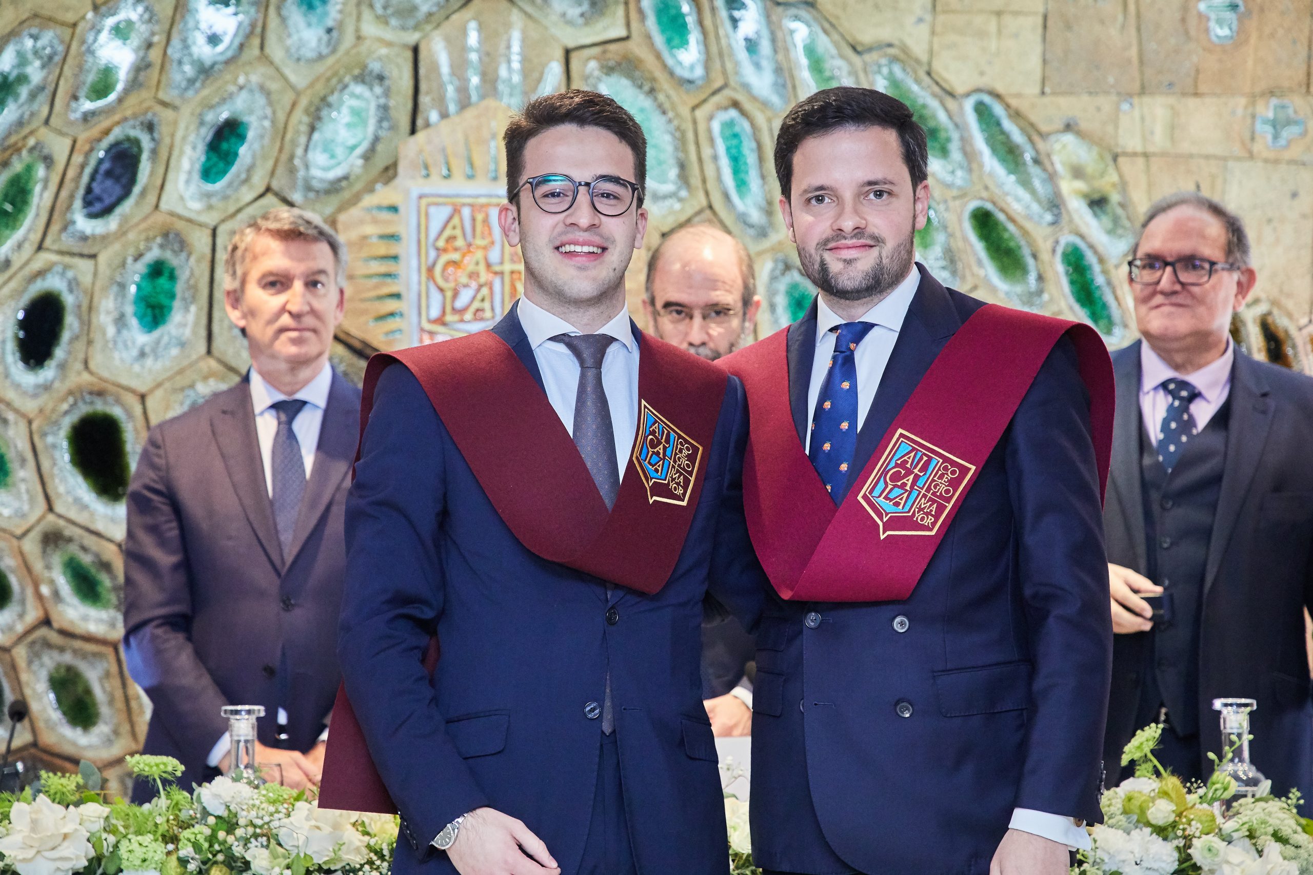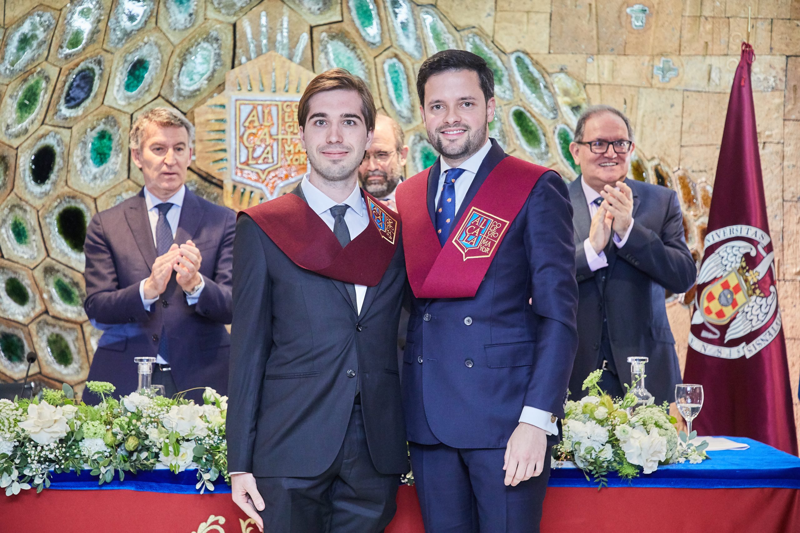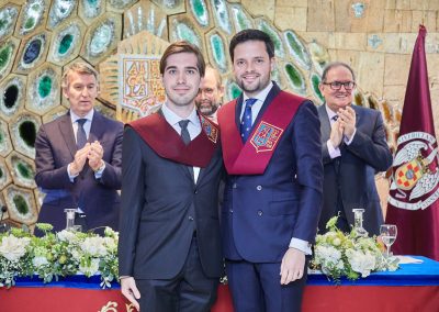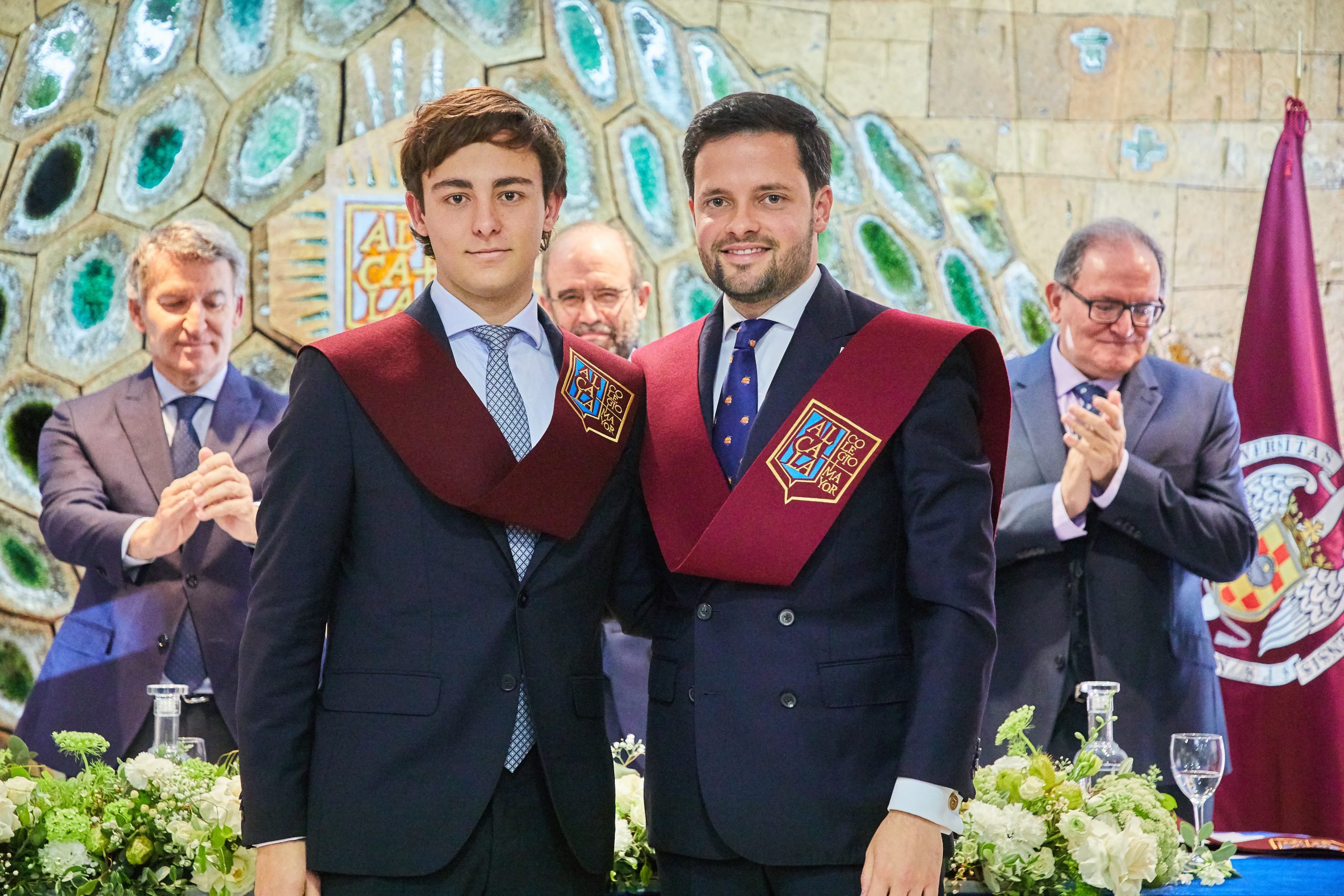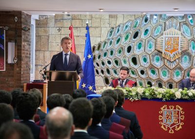 El acto académico contó este año con la intervención del Excmo. Sr. D. Alberto Núñez Feijóo, presidente nacional del Partido Popular y diputado en el Congreso de los Diputados, quien pronunció la lección magistral dirigida a los universitarios. En su intervención, subrayó el papel de la universidad como espacio de libertad, formación integral y compromiso con el bien común. Destacó la importancia de la vocación de servicio como fundamento de la vida pública y personal, e invitó a reperar la «buena política» que fue protagonista de la transición española.