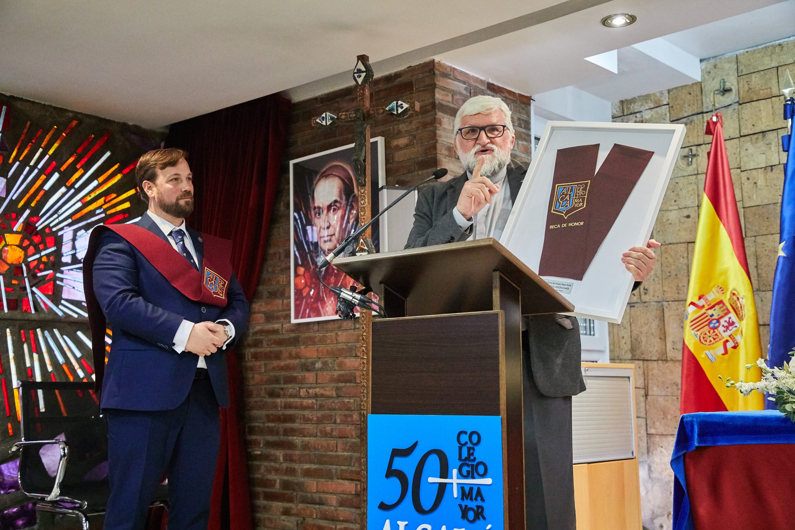 El Colegio Mayor Alcalá concedió también sus Becas de Honor, la más alta distinción institucional, a personas e instituciones que han mostrado una especial dedicación al mundo universitario, a la vida colegial o al servicio de la sociedad. Este año, recibieron esta distinción el profesor Ignacio Danvila del Valle, de la Universidad Complutense de Madrid, por su cercanía, su vocación docente y su compromiso con nuestras propuestas formativas. Abel Jiménez Gómez, director del Colegio Mayor Mendel, por su impulso a un modelo de convivencia universitario integrador y enriquecedor. Y por úlitmo, la Unidad Pastoral «Corazón de María», de los Misioneros Claretianos, por su trabajo evangelizador con jóvenes y su compromiso como Iglesia sinodal. Recogió la beca de honor institucional, el párroco, P. Jorge Domínguez Garrido, CMF.