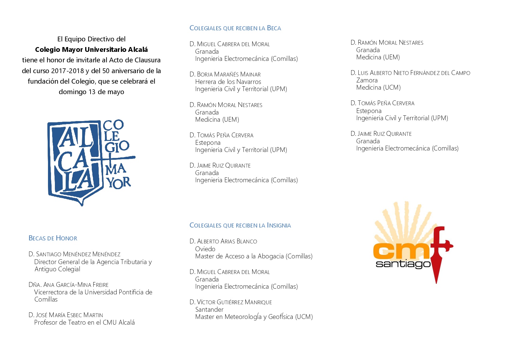Por su parte, recibirán la Beca de Honor del Colegio Mayor Alcalá, nuestra querida Dra. Dña. Ana García – Mina Freire, Vicerrectora de Servicios a la Comunidad Universitaria y Estudiantes de la Universidad Pontificia Comillas ICAI ICADE. Así mismo, recibe Beca de Honor, D. José María Esbec, Profesor de Artes Escénicas y Director de nuestra compañía de Teatro «Roncalá», que compartimos con el Colegio Mayor Roncalli.