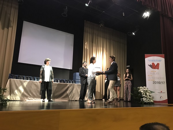 El pasado jueves 25 de mayo tuvo lugar la Clausura del curso 2016-17 de la asociación para actividades conjuntas de los Colegios Mayores de Madrid. En ella se entregaron los premios a las diferentes categorías que la asociación fomenta. Debate, fotografía, teatro, relato corto, música y deportes. Los colegiales de nuestro mayor tuvieron que subir a recoger el premio de campeones de la competición de Tenis de Mesa, el mejor jugador de Tenis de Mesa que recayó en Alberto Aliaga Gato.