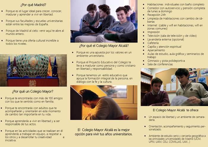 Esta es la nueva imagen del Colegio Mayor Alcalá para que lo conozcan los universitarios que quieren estudiar en Madrid. El 1 de abril comienza oficialmente el proceso de solicitud y entrevistas de selección para el curso 2016-17, y de esta manera presentamos el Colegio para aquellos que necesiten alojamiento para su etapa universitaria.