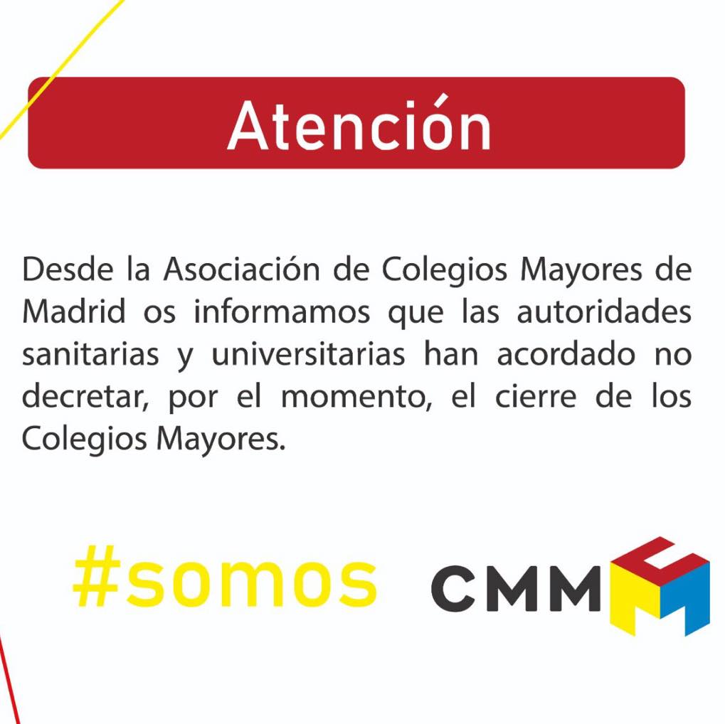 Les invitamos a que continúen atentos a nuestras Redes Sociales para mantenerse puntualmente informados, de especial modo ante la aparición de algunos bulos relacionados con supuestos cierres de los Colegios Mayores de Madrid.