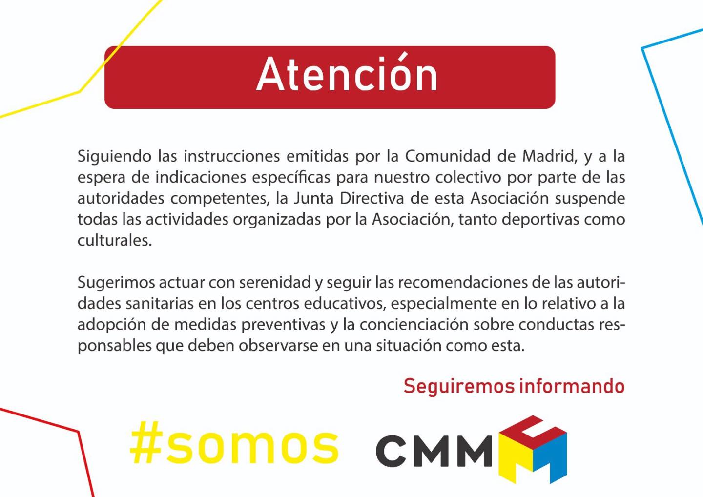 Por su parte, la Junta Directiva de la Asociación Colegios Mayores de Madrid ha emitido los siguientes comunicados, en orden cronológico, en relación al Coronavirus.