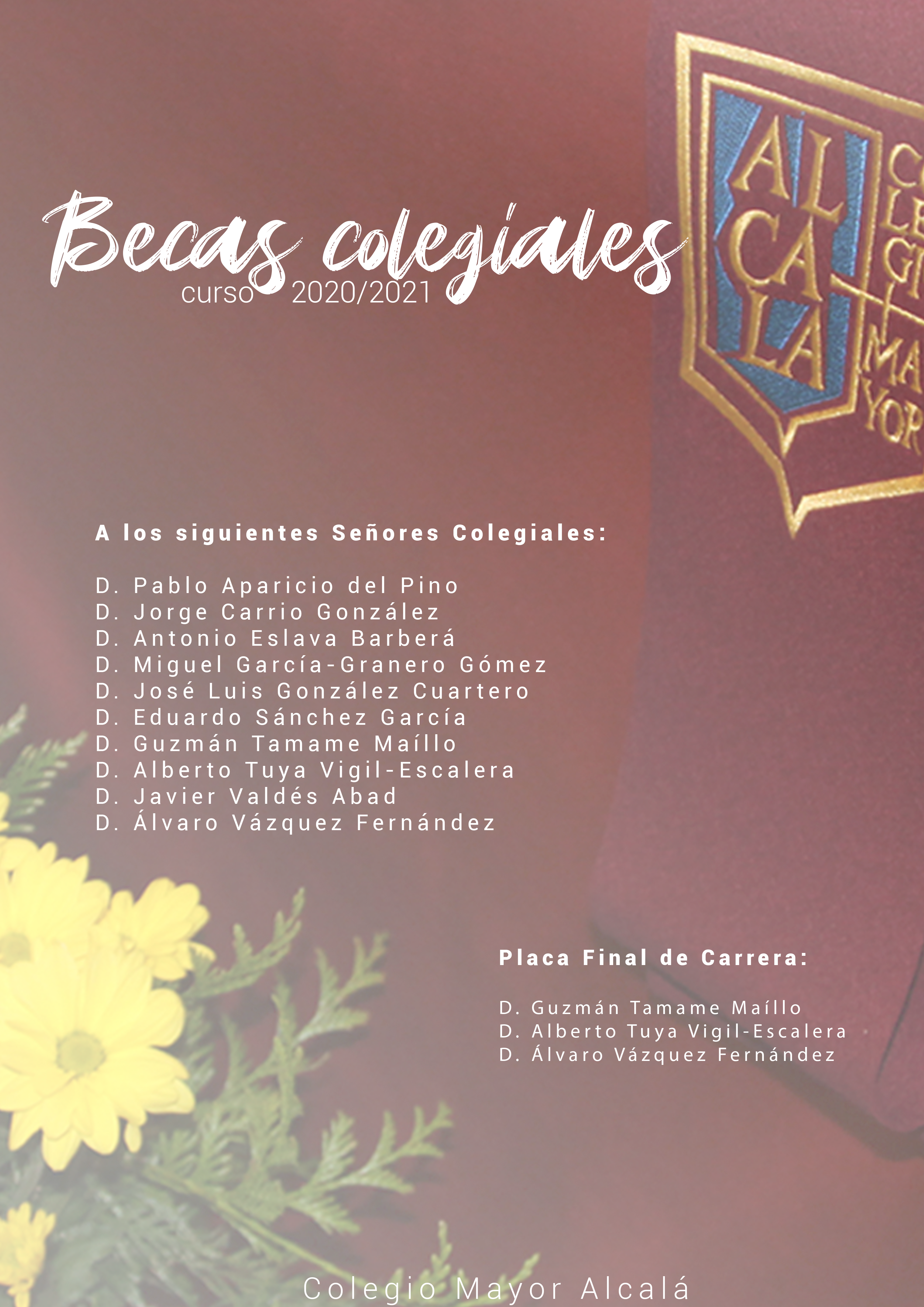 El Equipo Directivo del Colegio Mayor Alcalá, reunido en Sesión Extraordinaria, celebrada el día 13 de abril de 2021, ha acordado conceder la Beca Colegial de este Mayor a los siguientes señores colegiales: