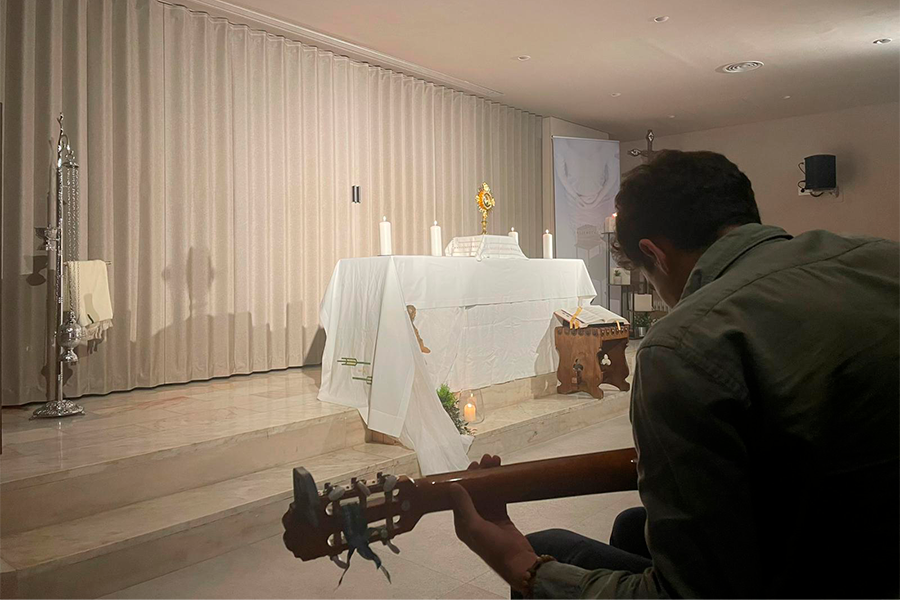 Durante varias horas, los colegiales fueron pasando por la sala, algunos en breves ratos, otros permaneciendo más tiempo, encontrando un clima sereno que invitaba a la reflexión y oración. La música, acompañada de forma discreta por algunos colegiales con la guitarra, ayudó a crear un ambiente de oración cercano y profundo, favoreciendo que cada uno pudiera expresar sus preocupaciones, agradecimientos y cansancios.