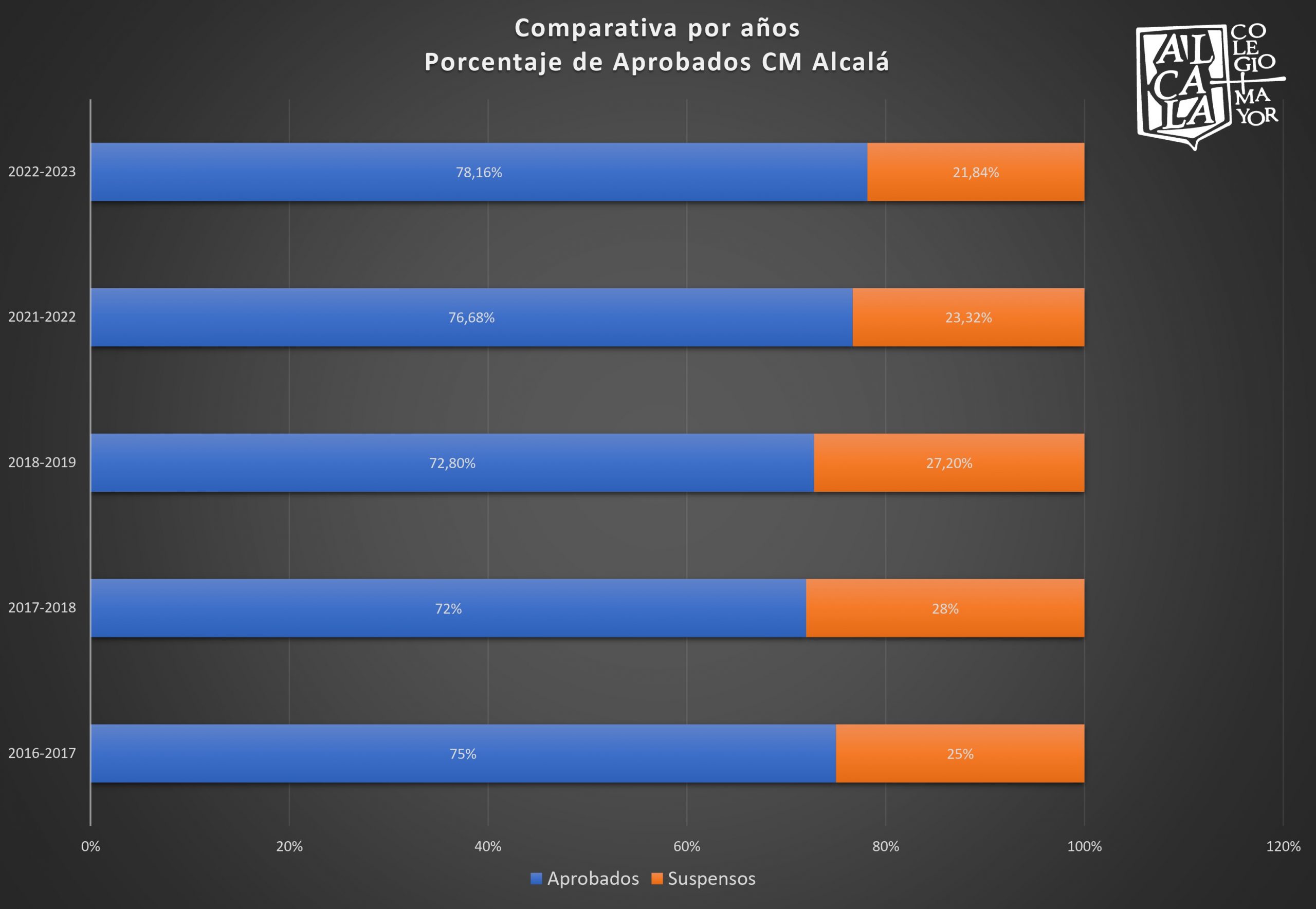 Realizando una comparativa por cursos, los colegiales de 1º aprueban casi el 80% de sus asignaturas, si bien es espectacular el 89% de aprobados logrado por colegiales de 3º curso en adelante.