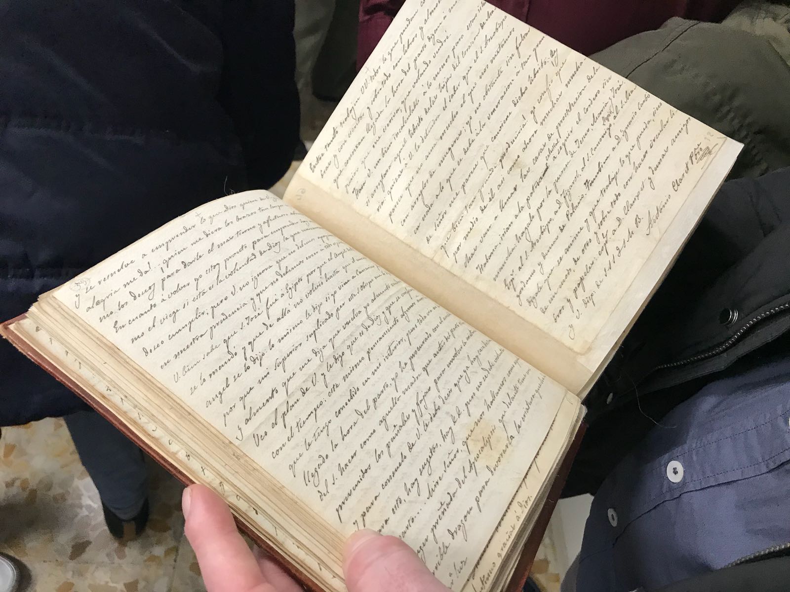 Pero antes de regresar a casa, hemos tomado contacto con la identidad de nuestro Mayor, visitando la sede general de los Misioneros Claretianos. Nos ha recibido el P. Manuel Tamargo, ecónomo general de la congregación, antiguo colegial y director del CMU Alcalá entre 1993 y 1996. Y nos han guiado los Padres Joseba y Vicente por todas las dependencias de la casa general. Hemos podido ver los retratos de todos los padres superiores, el archivo de la congregación, la sala de reuniones del gobierno general, los retratos más famosos del padre Claret, la capilla de la casa con unos frescos de Cerezo Barredo, y por último los manuscritos de la autobiografía del padre Claret, que hemos podido tocar con nuestras manos. ¡Nos hemos sentido como en casa! Además, el director del colegio y el coordinador de la actividad, Ignacio Blazquez, le hemos hecho entrega al Padre Tamargo del obsequio conmemorativo de nuestro 50 aniversario.